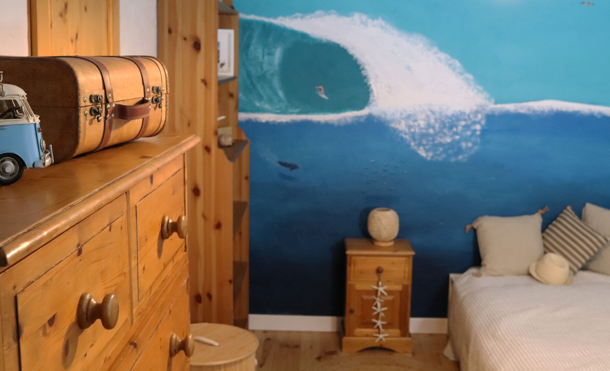 Ce projet de transformation d’une chambre d’enfant avec lambris sombre sur les murs et plafond en une chambre d’ado fan de surf, lumineuse et chaleureuse à la fois :