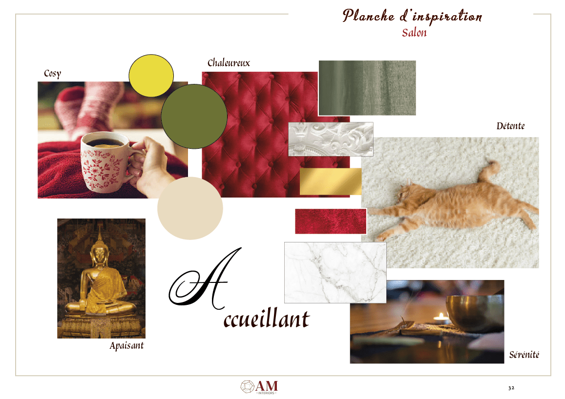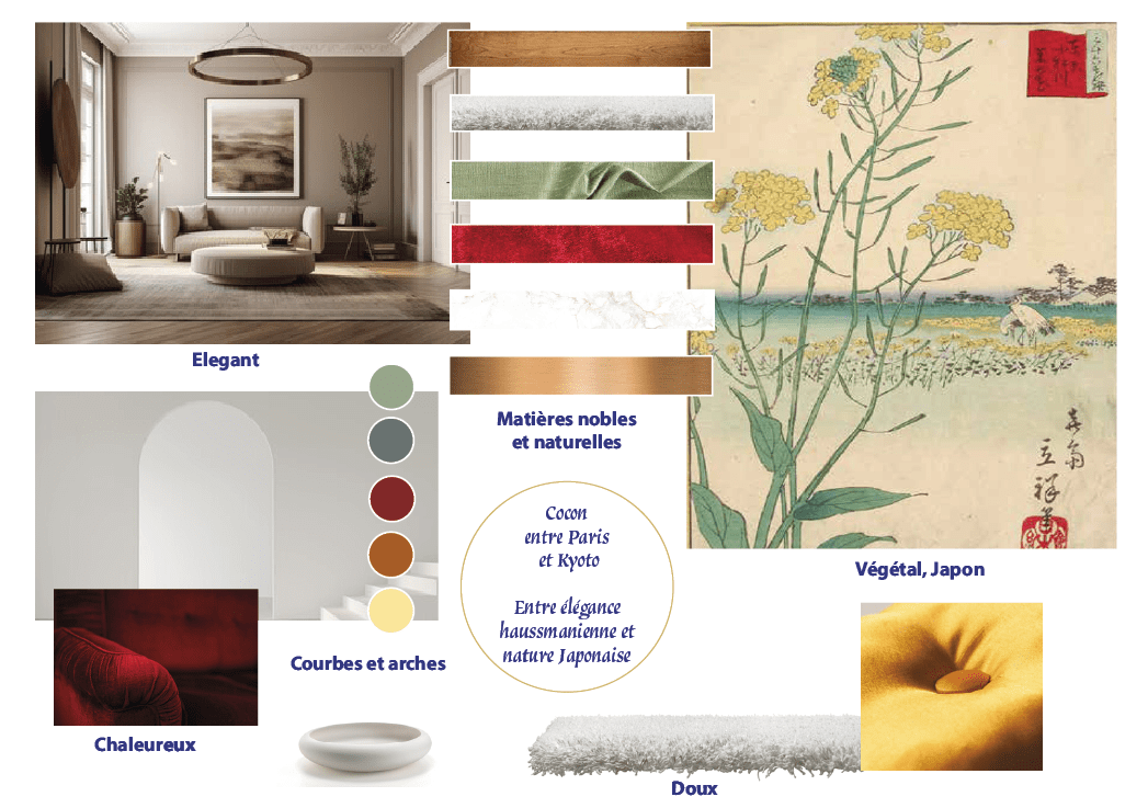 Planche d’ambiance – Moodboard : représentation visuelle et créative de l’atmosphère générale du projet, intégrant des palettes de couleurs, des textures et des inspirations pour traduire l’esprit du lieu.