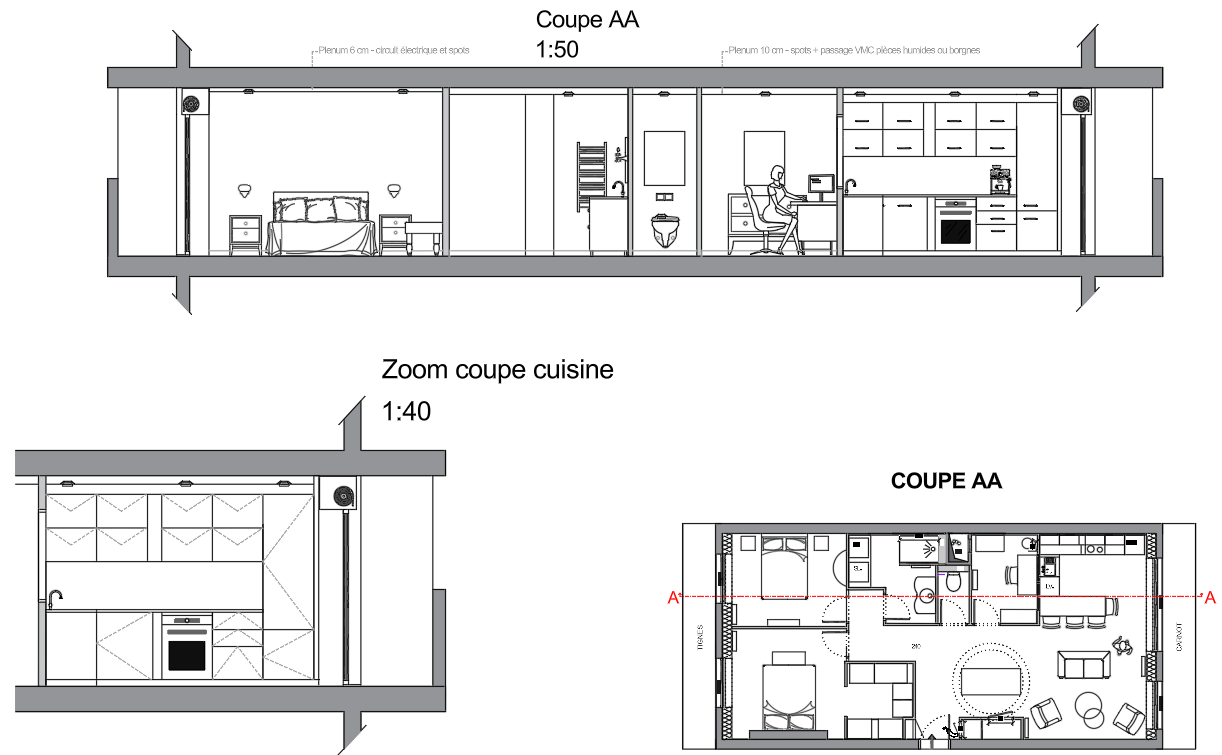- Concevoir une cuisine compacte et fonctionnelle afin de privilégier l’aménagement d’un salon spacieux et d’un bureau.