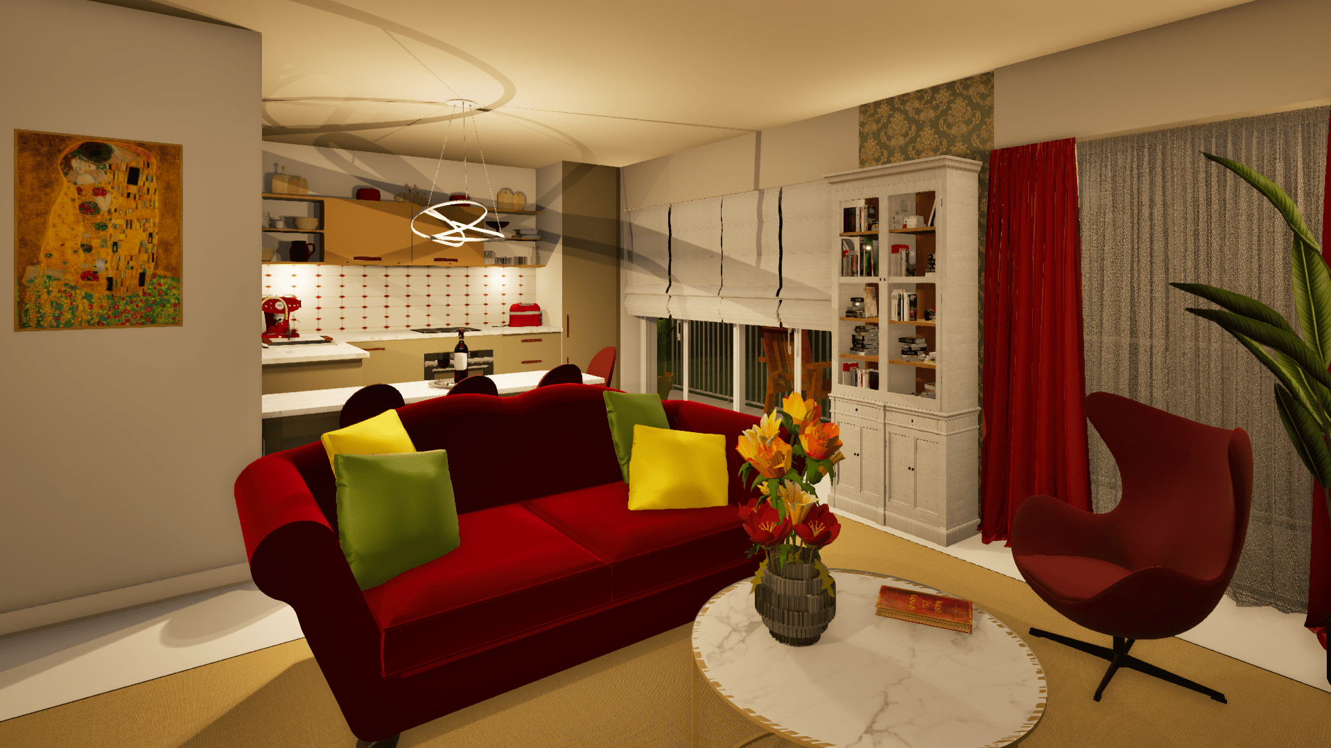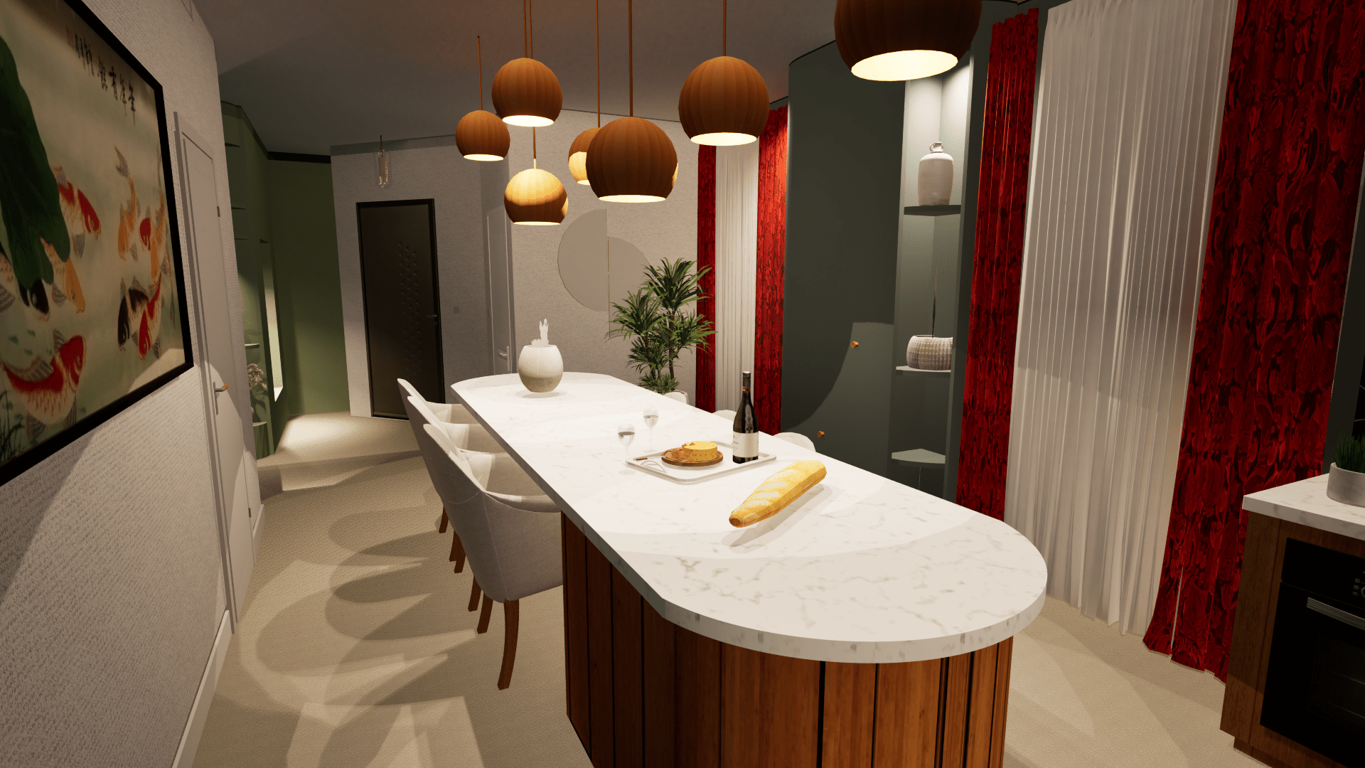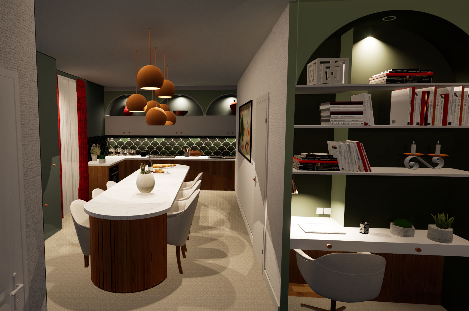 Concernant l’esthétique et l’ambiance, les clients recherchaient une touche vintage avec des accents baroques, une atmosphère chaleureuse et colorée pour l’espace de vie, et un univers plus sobre pour le bureau. La cuisine sur mesure et le salon s’articulent autour d’une palette de rouge, vert, blanc, et paille, créant un ensemble à la fois joyeux et élégant. Le papier peint, le marbre, et le velours rouge reprennent les codes baroques, tandis que la cuisine évoque l’esthétique des années 1950.