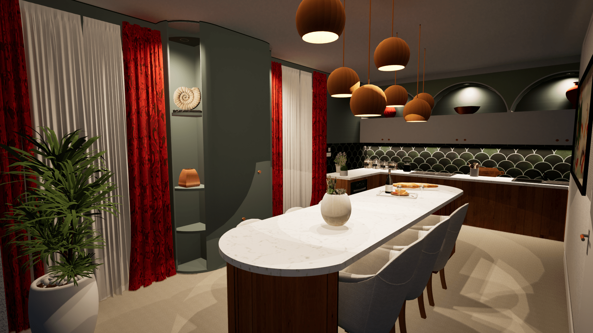 - Imaginer une cuisine équipée d’un îlot pouvant accueillir six convives.