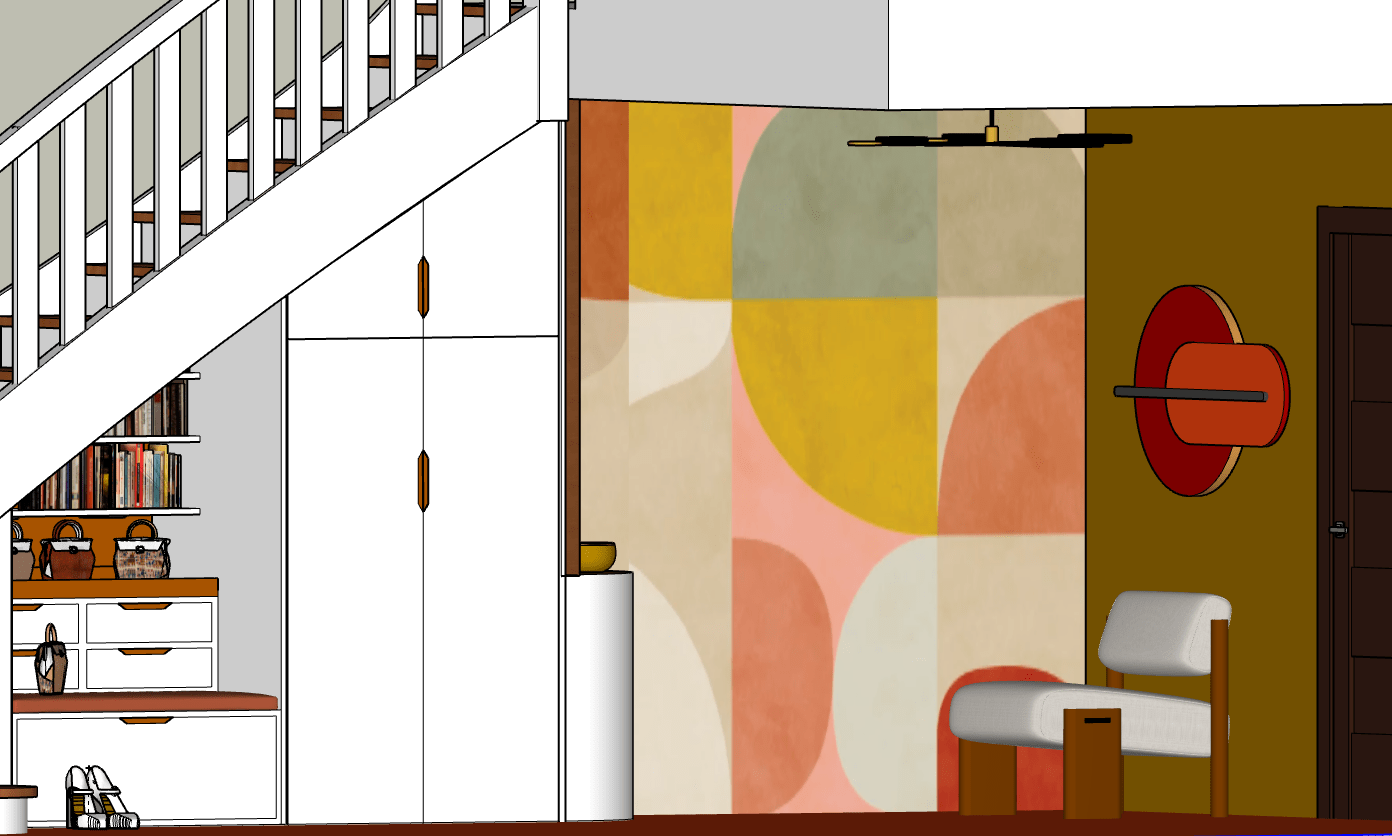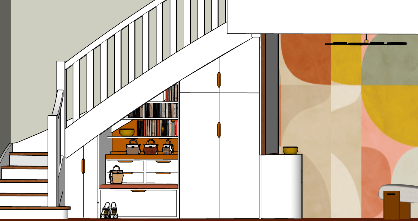 - Optimiser l’espace sous l’escalier avec des rangements pour manteaux, chaussures, sacs, et quatre chaises pliantes.
