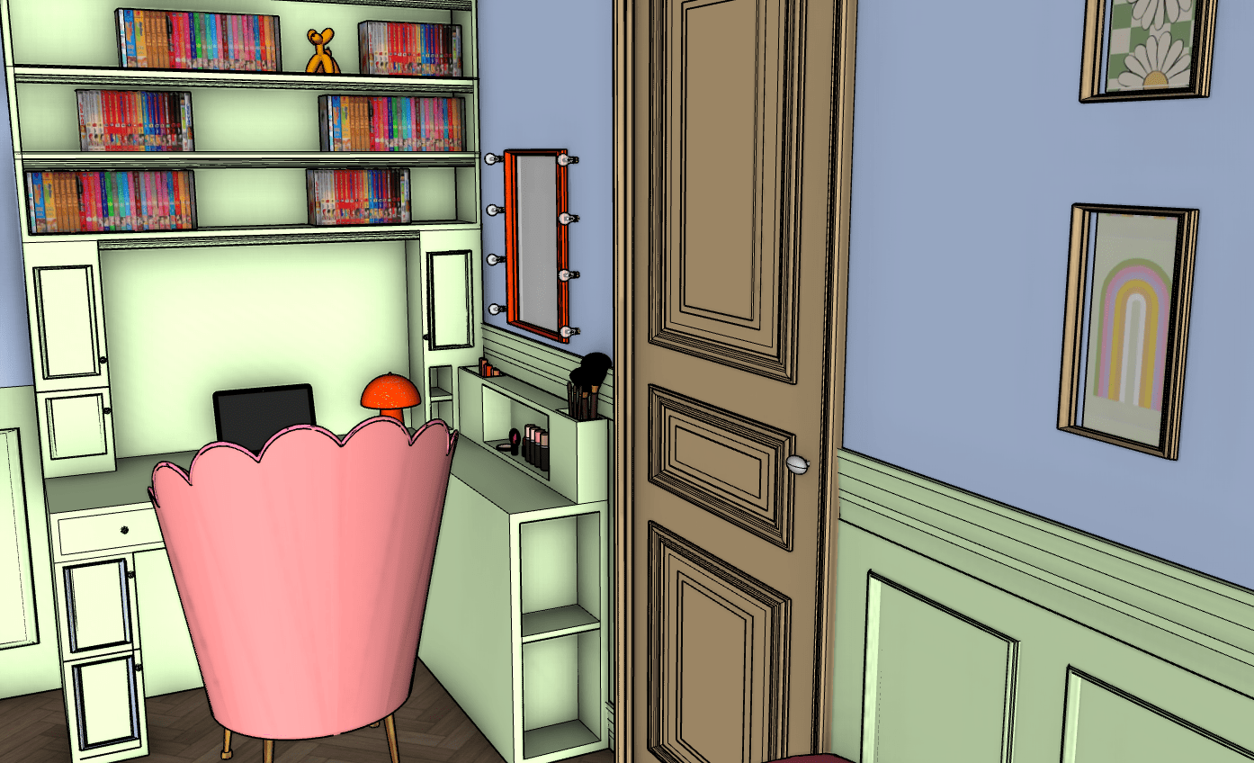 Pour répondre à ces besoins, nous avons conçu un mobilier sur mesure, ingénieux et polyvalent. Ce meuble 3-en-1 optimise l’espace derrière la porte en proposant un bureau aux dimensions généreuses, qui se transforme également en coiffeuse grâce à un miroir éclairé et à de nombreux rangements dédiés au maquillage. Par ailleurs, une bibliothèque intégrée en hauteur permet de ranger mangas et objets décoratifs, apportant une touche personnelle et ordonnée à l’ensemble.