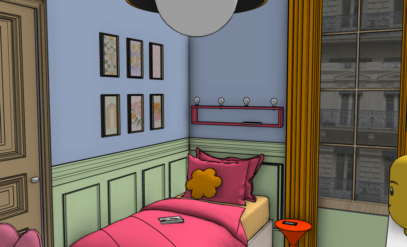 L’ensemble de la chambre se distingue par des couleurs vives et dynamiques, inspirées de la culture pop et du style Memphis. Ce choix audacieux insuffle une énergie contemporaine à cet espace, tout en sublimant ses proportions classiques d’inspiration haussmannienne.
